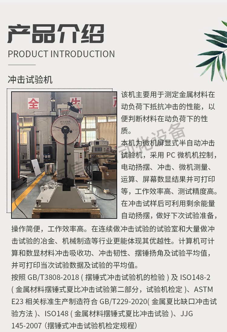 本機(jī)為微機(jī)屏顯式半自動(dòng)沖擊試驗(yàn)機(jī),采用PC微機(jī)機(jī)控制,電動(dòng)揚(yáng)擺、沖擊、微機(jī)測(cè)量、運(yùn)算、屏幕數(shù)顯結(jié)果并可打印等,工作效率高、測(cè)試精度高。在沖擊試樣后可利用剩余能量自動(dòng)揚(yáng)擺,做好下次試驗(yàn)準(zhǔn)備,操作簡(jiǎn)便,工作效率高。在連續(xù)做沖擊試驗(yàn)的試驗(yàn)室和大量做沖擊試驗(yàn)的冶金、機(jī)械制造等行業(yè)更能體現(xiàn)其優(yōu)越性。計(jì)算機(jī)可計(jì)算和數(shù)顯材料沖擊吸收功、沖擊韌性、擺錘揚(yáng)角及試驗(yàn)平均值,并可打印當(dāng)次試驗(yàn)數(shù)據(jù)及試驗(yàn)的平均值。 按照 GB/T3808-2018 (擺錘式?jīng)_擊試驗(yàn)機(jī)的檢驗(yàn))及 ISO148-2(金屬材料擺錘式夏比沖擊試驗(yàn)第二部分,試驗(yàn)機(jī)檢定)、ASTM E23 相關(guān)標(biāo)準(zhǔn)生產(chǎn)制造符合 GB/T229-2020(金屬夏比缺口沖擊試驗(yàn)方法)、ISO148 (金屬材料擺錘式夏比沖擊試驗(yàn))、JJG 145-2007 (擺錘式?jīng)_擊試驗(yàn)機(jī)檢定規(guī)程) 四、主要技術(shù)指標(biāo): 1、沖擊能量:150J、300J 2、擺錘預(yù)揚(yáng)角:150° 3、擺軸中心至沖擊點(diǎn)距離:750mm 4、沖擊速度:5.2m/s 5、試樣支座跨距:40mm 6、鉗口圓角:R1-1.5mm 7、沖擊刀刃圓角:R2-2.5mm 8、沖擊刀厚度:16mm 9、角度準(zhǔn)確度:±0.1° 10、試樣尺寸:10×10×55mm 11、外形尺寸:2124 mm×600 mm×1340 mm 12、試驗(yàn)機(jī)凈重:450Kg 13、電源:交流三相 380V±10% 50HZ 5A 14、環(huán)境條件:周圍環(huán)境中無(wú)腐蝕介質(zhì),無(wú)震動(dòng),無(wú)強(qiáng)電磁場(chǎng)干擾。 五、設(shè)備主要配置: 1、300焦耳主機(jī)一臺(tái); 2、150J、300J 擺錘各一個(gè) 3、取擺傳動(dòng)裝置一套(裝在主機(jī)上) 4、自動(dòng)掛擺裝置一套(裝在主機(jī)上) 5、保險(xiǎn)機(jī)構(gòu)一套(裝在主機(jī)上) 6、安全防護(hù)裝置一套 7、擺錘拆卸器一只 8、支座調(diào)校器一只 9、試樣對(duì)中器一只 10、聯(lián)想打印機(jī)一套 專用測(cè)量軟件一套