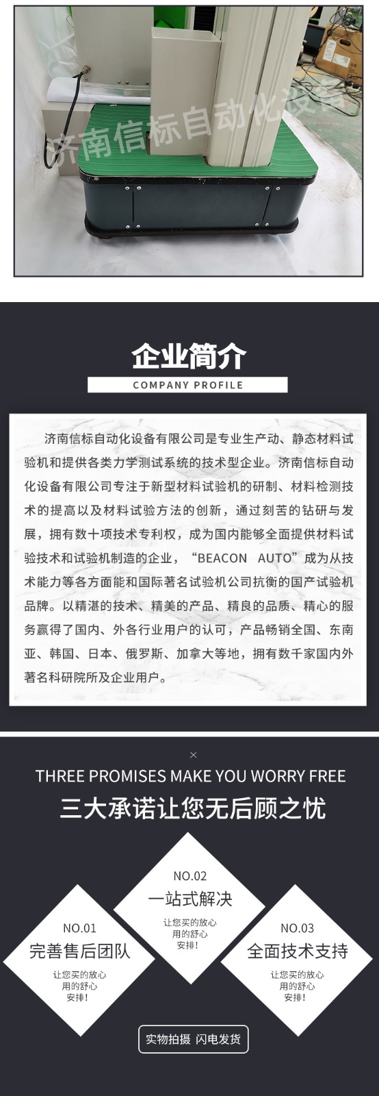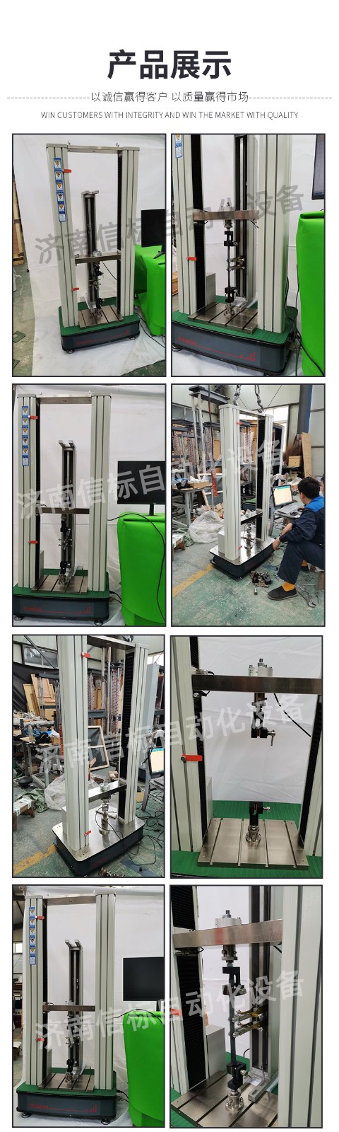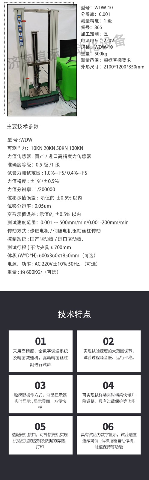 基本信息 型號(hào):WDW-10 分辨率:0.001 測(cè)量精度:1級(jí) 貨號(hào):865 加工定制:是 電源電壓:220V 重量:500kg 測(cè)量范圍:根據(jù)客戶要求 外形尺寸:2100*1200*850mm 可測(cè)試驗(yàn)力: 10KN 20KN 50KN 100KN 力值傳感器: 國(guó)產(chǎn)/進(jìn)口高精度力傳感器 準(zhǔn)確度等級(jí): 0.5級(jí)/1級(jí) 試驗(yàn)力測(cè)試范圍: 1.0%~ FS/ 0.4%~ FS 力值精度: ±1%/±0.5% 力值分辨率: 1/200000 位移示值誤差: 示值的±0.5%以內(nèi) 位移分辯率: 0.05um 變形示值誤差: 示值的±0.5%以內(nèi) 測(cè)試速度范圍: 0.001~500mm/min/0.001-200mm/min 傳動(dòng)方式: 步進(jìn)電機(jī)/伺服電機(jī)驅(qū)動(dòng)絲杠傳動(dòng) 控制系統(tǒng): 國(guó)產(chǎn)驅(qū)動(dòng)器/進(jìn)口驅(qū)動(dòng)器, 測(cè)試行程(不含夾具): 700mm 體積(W*D*H): 600x360x1850mm(可選) 電源、功率: AC 220V±10% 50Hz,(可選) 重量: 約600KG/(可選) 自動(dòng)停機(jī)裝置 機(jī)械、程控
