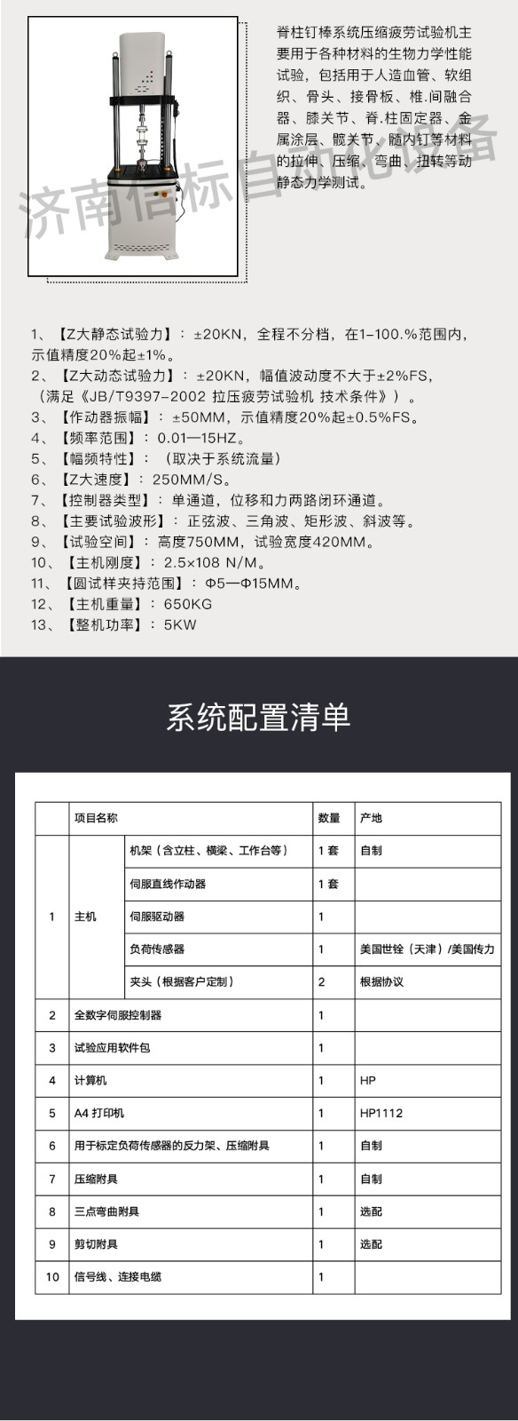 濟(jì)南信標(biāo)自動(dòng)化設(shè)備有限公司主要生產(chǎn):動(dòng)靜態(tài)萬能疲勞試驗(yàn)機(jī),接骨板彎曲試驗(yàn)機(jī),縫合線拉伸疲勞試驗(yàn)機(jī),髖膝關(guān)節(jié)磨損試驗(yàn)機(jī),電子萬能試驗(yàn)機(jī)、液壓萬能試驗(yàn)機(jī)、巖石三軸、四軸,電液拉力試驗(yàn)機(jī),材料試驗(yàn)機(jī),高低溫蠕變,高低頻疲勞,拉伸、扭轉(zhuǎn)、杯突等二十多個(gè)系列兩千多個(gè)的品種。
