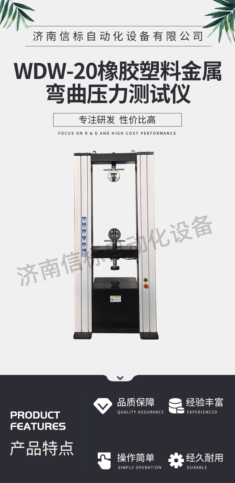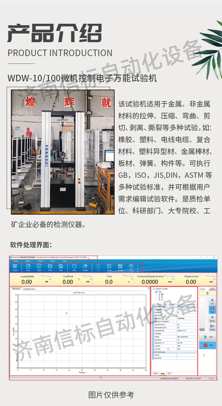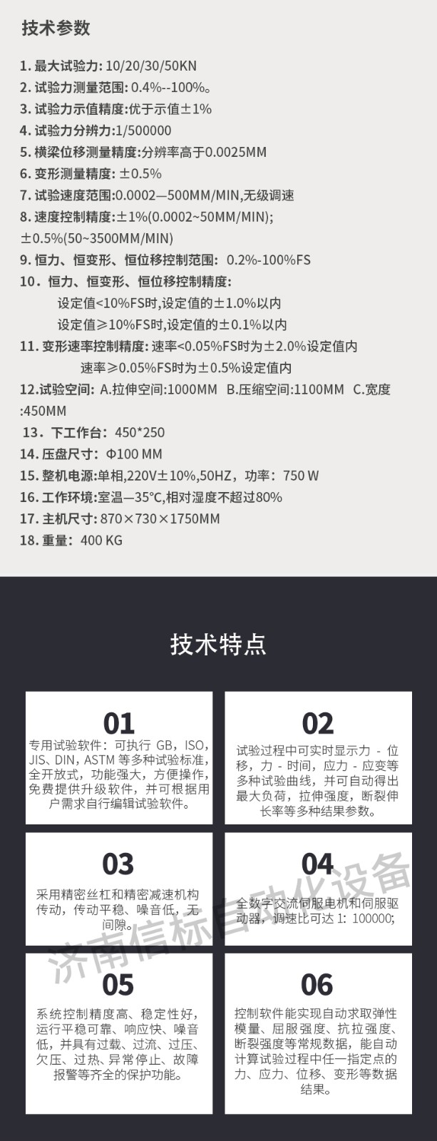 該試驗機適用于金屬、非金屬材料的拉伸、壓縮、彎曲、剪切、剝離、撕裂等多種試驗,如:橡膠、塑料、電線電纜、復(fù)合材料、塑料異型材、金屬棒材、板材、彈簧、構(gòu)件等??蓤?zhí)行GB,ISO,JIS,DIN,ASTM等多種試驗標準,并可根據(jù)用戶需求編輯試驗軟件。是質(zhì)檢單位、科研部門、大專院校、工礦企業(yè)必備的檢測儀器。 二、測量參數(shù): 1. 最大試驗力: 10/20/30/50kN 2. 試驗力測量范圍: 0.4%--100%。 3. 試驗力示值精度:優(yōu)于示值±1% 4. 試驗力分辨力:1/500000 5. 橫梁位移測量精度:分辨率高于0.0025mm 6. 變形測量精度: ±0.5% 7. 試驗速度范圍:0.0002—500mm/min,無級調(diào)速 8. 速度控制精度:±1%(0.0002~50mm/min); ±0.5%(50~3500mm/min) 9. 恒力、恒變形、恒位移控制范圍: 0.2%-100%FS 10.恒力、恒變形、恒位移控制精度: 設(shè)定值<10%FS時,設(shè)定值的±1.0%以內(nèi) 設(shè)定值≥10%FS時,設(shè)定值的±0.1%以內(nèi) 11. 變形速率控制精度: 速率<0.05%FS時為±2.0%設(shè)定值內(nèi) 速率≥0.05%FS時為±0.5%設(shè)定值內(nèi) 12.試驗空間: A.拉伸空間:1000mm B.壓縮空間:1100mm C.寬度:450mm 13.下工作臺:450*250 14. 壓盤尺寸:φ100 mm 15. 整機電源:單相,220V±10%,50Hz,功率:750 W 16. 工作環(huán)境:室溫—35℃,相對濕度不超過80% 17. 主機尺寸: 870×730×1750mm 18. 重量:400 kg 三、產(chǎn)品配置: 1、主機 一套 2、松下A7全數(shù)字伺服電機及伺服驅(qū)動器; 一套 3、高精度負荷傳感器; 5kn/1kn/500N/200/ 各一支 4、Hiwin精密滾珠絲杠; 2支 5、光電編碼器(2500線,內(nèi)置); 1支 6、夾具:滿足海綿/汽車座椅所需工裝 1套(有多種)