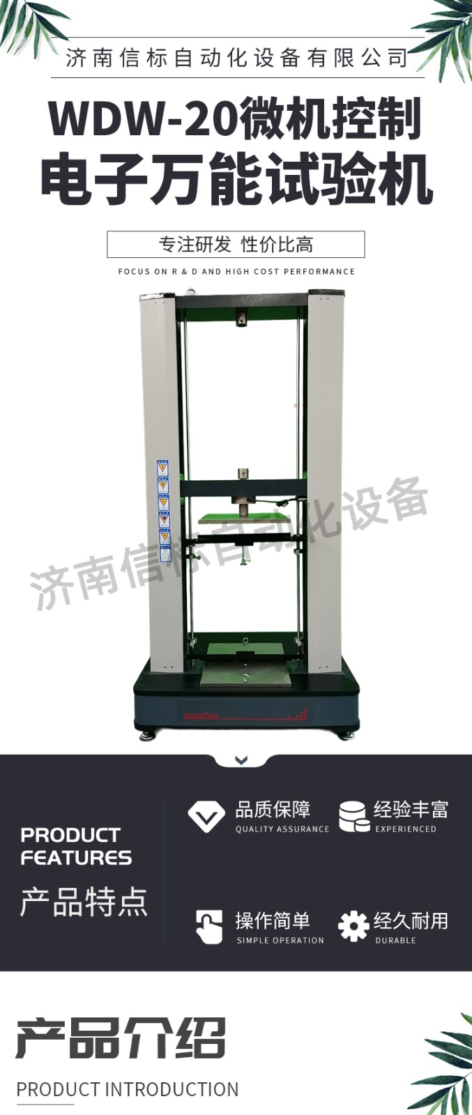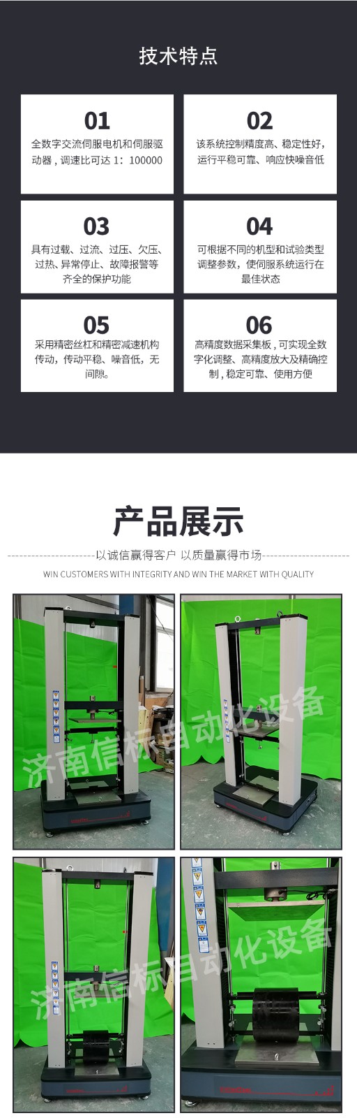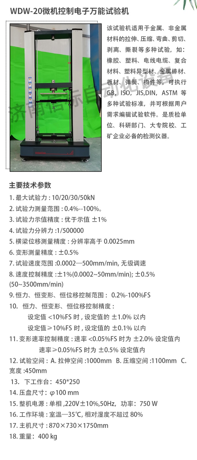 測量參數(shù): 1. 最大試驗力: 10/20/30/50kN 2. 試驗力測量范圍: 0.4%--100%。 3. 試驗力示值精度:優(yōu)于示值±1% 4. 試驗力分辨力:1/500000 5. 橫梁位移測量精度:分辨率高于0.0025mm 6. 變形測量精度: ±0.5% 7. 試驗速度范圍:0.0002—500mm/min,無級調(diào)速 8. 速度控制精度:±1%(0.0002~50mm/min); ±0.5%(50~3500mm/min) 9. 恒力、恒變形、恒位移控制范圍: 0.2%-100%FS 10.恒力、恒變形、恒位移控制精度: 設(shè)定值<10%FS時,設(shè)定值的±1.0%以內(nèi) 設(shè)定值≥10%FS時,設(shè)定值的±0.1%以內(nèi) 11. 變形速率控制精度: 速率<0.05%FS時為±2.0%設(shè)定值內(nèi) 速率≥0.05%FS時為±0.5%設(shè)定值內(nèi) 12. 試驗空間: A.拉伸空間:1000mm B.壓縮空間:1100mm C.寬度:450mm 13.下工作臺:450*250 14. 壓盤尺寸:φ100 mm 15. 整機電源:單相,220V±10%,50Hz,功率:750 W 16. 工作環(huán)境:室溫—35℃,相對濕度不超過80% 17. 主機尺寸: 870×730×1750mm 18. 重量:400 kg 產(chǎn)品配置: 1、主機 一套 2、松下A7全數(shù)字伺服電機及伺服驅(qū)動器; 一套 3、高精度負荷傳感器; 5kn/1kn/500N/200/ 各一支 4、Hiwin精密滾珠絲杠; 2支 5、光電編碼器(2500線,內(nèi)置); 1支 6、夾具:滿足海綿/汽車座椅所需工裝 1套(有多種) 7、三閉環(huán)測量系統(tǒng)一套,采用力,位移,應變等多種控制方式,試驗過程中可實時顯示力-位移,力-時間,應力-應變等多種試驗曲線,并可自動得出最大負荷,拉伸強度,斷裂伸長率等多種 結(jié)果參數(shù)。 8、HP品牌計算機,21寸液晶顯示器; 9、打印機:HPA4彩色噴墨打印機; 10、專用試驗軟件:可執(zhí)行GB,ISO,JIS、DIN,ASTM等多種試驗標準,全開放式,功能強大,方便操作,免費提供升級軟件,并可根據(jù)用戶需求自行編輯試驗軟件。