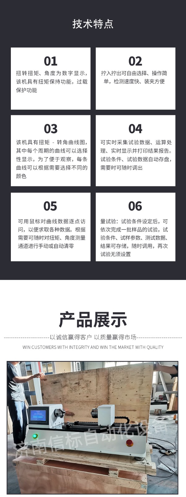 數(shù)顯扭轉試驗機技術指標: 1 扭矩測量范圍:20Nm 2 扭矩分辨力:±1/300000 3 轉角最小讀數(shù)值:0.01圈 4 扭矩示值相對誤差:測量范圍內優(yōu)于±1% (正轉和反轉兩個方向) 5 扭矩示值重復性相對誤差:測量范圍內≤1% 6 試驗機加載速度:0.004r/min~20r/min 7 兩夾頭間距離:0~250mm 8 兩夾頭間的同軸度誤差:≤Φ0.10mm 9 試驗機超過額定扭矩的5%~10%時,試驗機自動停機(也可以自行設置) 具有過電壓、過電流、超速、過載等安全保護 10 電源電壓:220VAC±10% 50Hz 11 主機尺寸:1700×700×1200(mm) 座式操作 功能特點: 1、適用于WINDOWS平臺的中文試驗軟件,實現(xiàn)試驗數(shù)據(jù)采集處理。 2、可實時采集試驗數(shù)據(jù)、運算處理、實時顯示并打印結果報告。 3、曲線遍歷:可用鼠標對曲線數(shù)據(jù)逐點訪問,以便求取各種數(shù)據(jù)。扭矩與扭角關系曲線中能反映任意點扭矩—角度的關系,能方便地在曲線上找到所求數(shù)據(jù)點;可方便地對曲線局部放大還原等。 4、根據(jù)需要可隨時對扭矩、角度測量通道進行手動或自動清零。 5、自動存盤:試驗條件、試驗數(shù)據(jù)自動存盤,需要時可隨時調出。 6、批量試驗:試驗條件設定后,可依次完成一批樣品的試驗,試驗條件、試樣參數(shù)、測試數(shù)據(jù)、結果可存儲,隨時調用,再次試驗無須設置。 7、打印試驗報表。